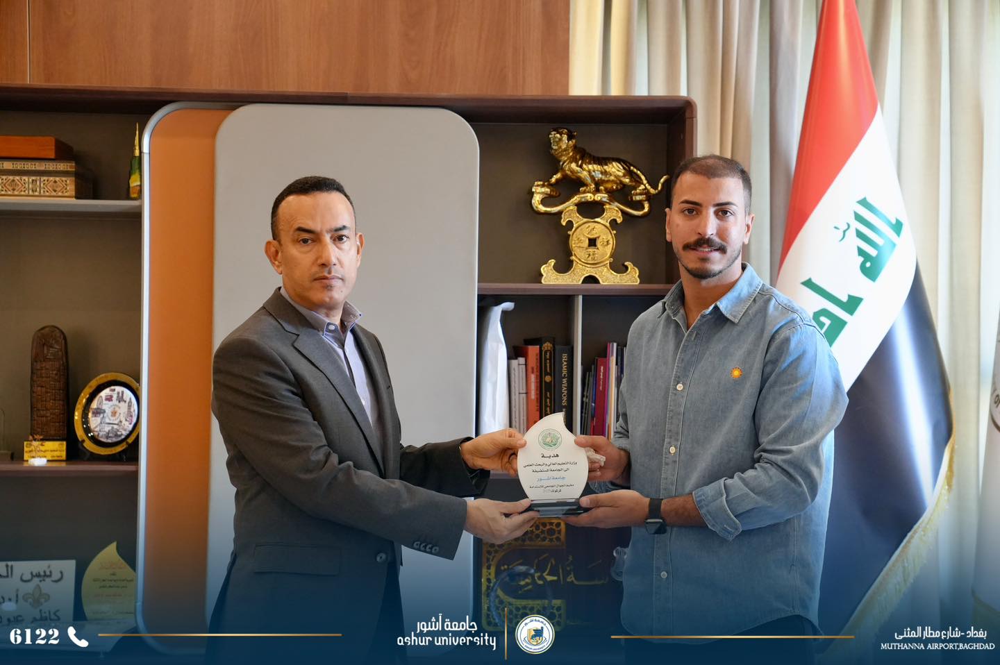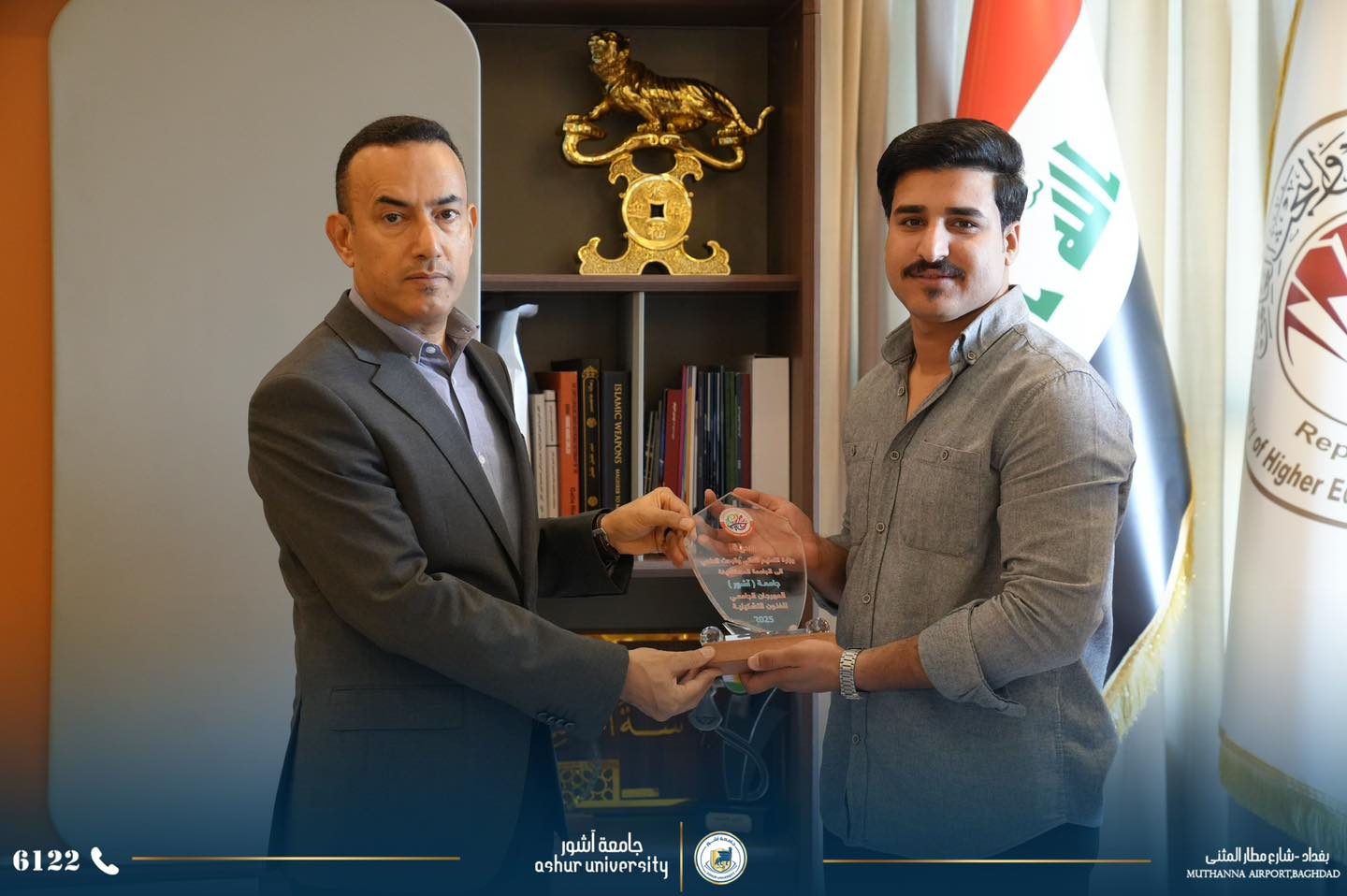 كرّم السيد رئيس جامعة آشور الاستاذ الدكتور كاظم عبود الماجدي المحترم . الطلبة المشاركين في مسابقة الرسم الحر بعد تحقيقهم المركز الثاني على مستوى الجامعات، تقديرًا لجهودهم الفنية وإبداعهم المتميّز الذي جسّد روح الابتكار والتعبير الفني الهادف.