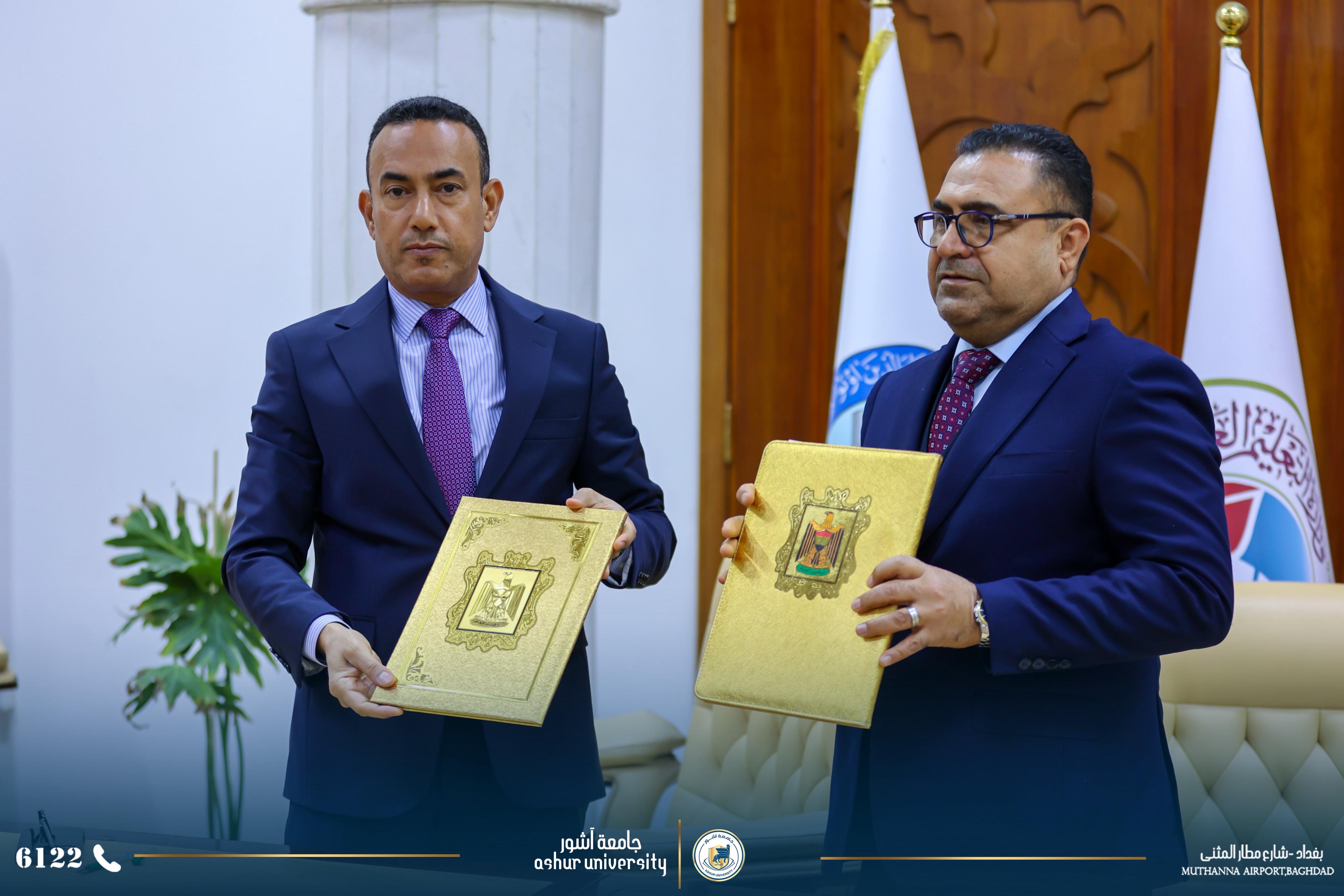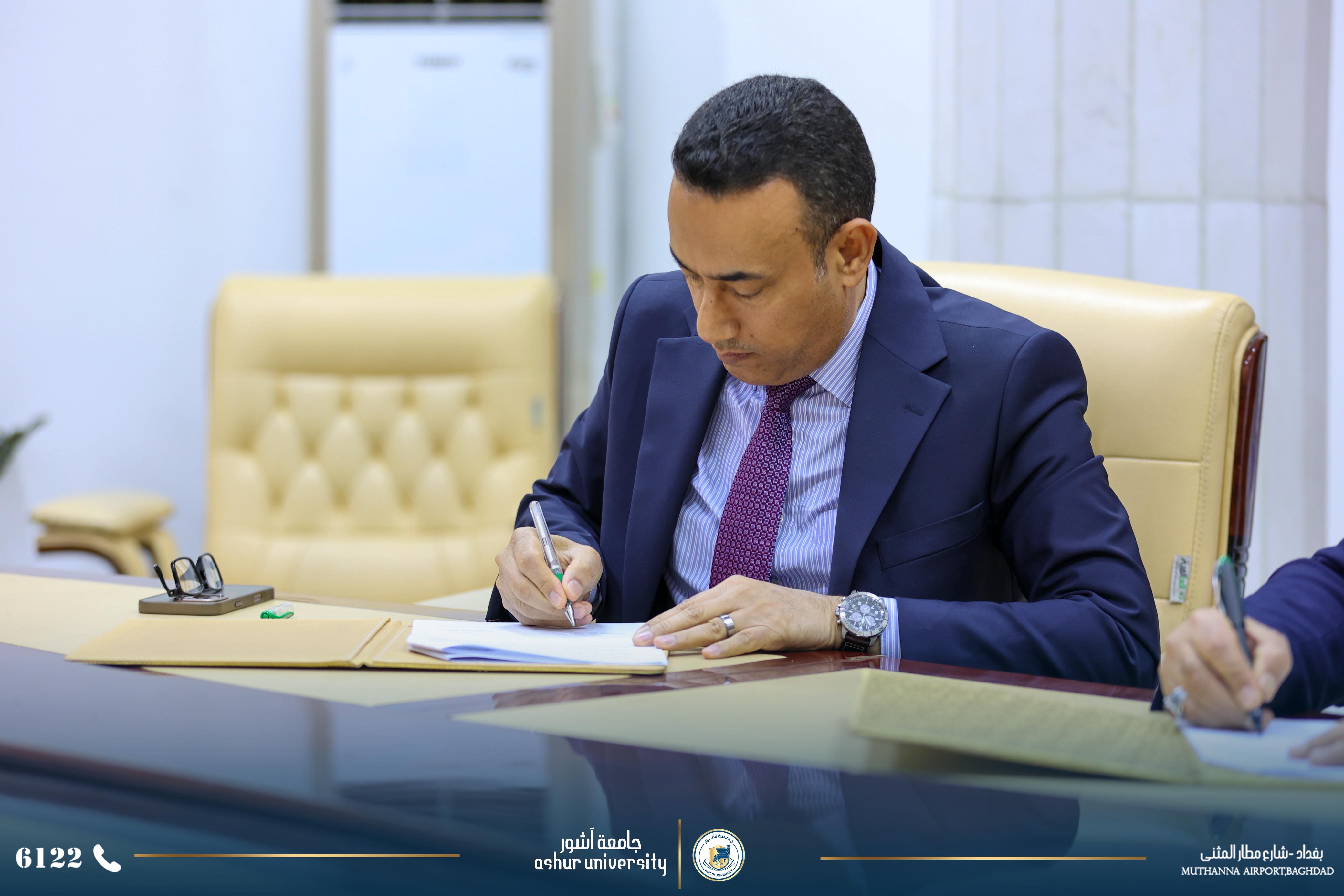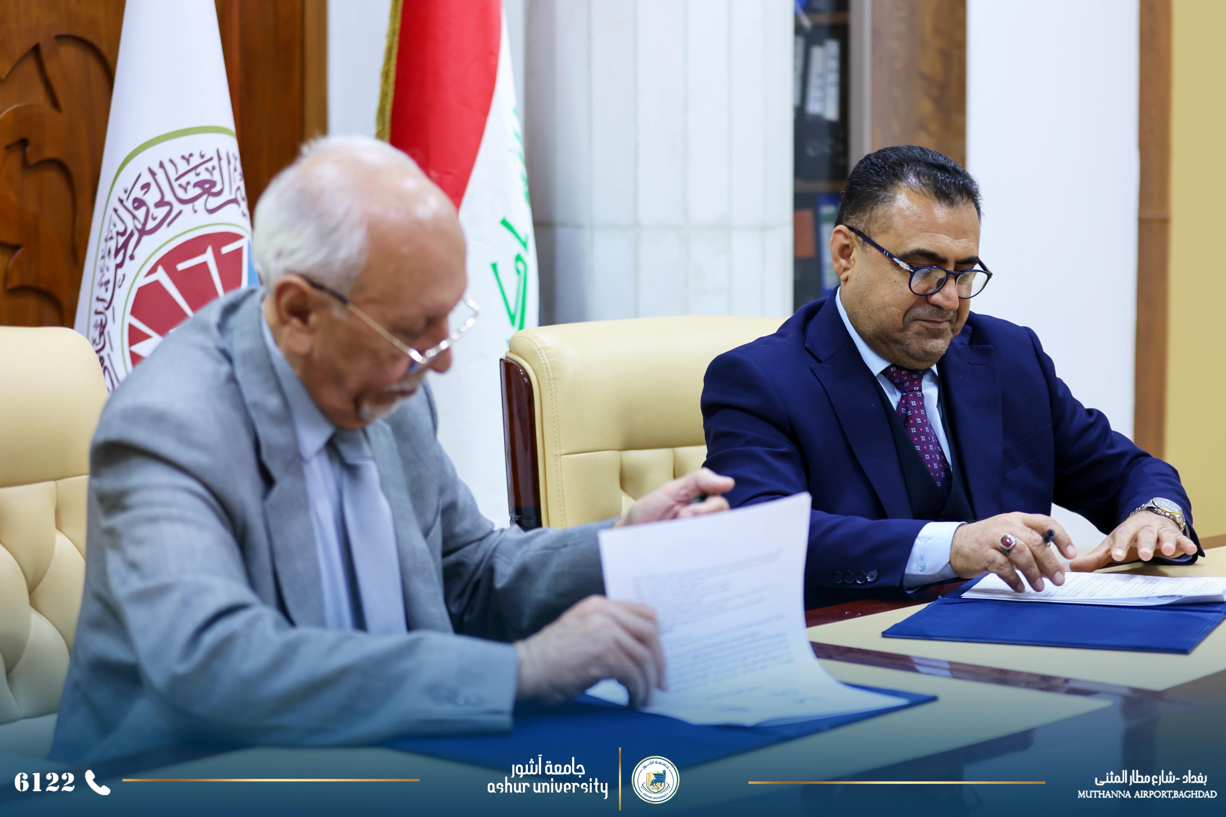 من اجل زيادة أواصر التعاون العلمي والأكاديمي والبحثي وفتح آفاق تعاون جدي لرفع المستوى العلمي والبحثي والارتقاء بهما لخدمة الكوادر التدريسية وطلبة الجامعتين فقد تم اليوم الخميس الموافق ٢٠٢٦/٣/٥ توقيع اتفاقية تعاون وتوأمة بين الجامعتين الاولى ووقعت بين السيد رئيس جامعة آشور الاستاذ الدكتور كاظم عبود الماجدي المحترم ورئيس جامعة الكرخ للعلوم الاستاذ الدكتور جمعة سلمان جياد المحترم . والثانية (للتوئمه ) وقد وقعت بين كليتي الهندسة ،قسم هندسة الأمن السيبراني في الجامعتين كل من الأستاذ الدكتور جمعة سلمان جياد عميد كلية الهندسة في جامعة الكرخ (وكالة ) والاستاذ الدكتور علي حسين عتيوي عميد كلية الهندسة في جامعة آشور. حضر توقيع الاتفاقيتين السادة مساعدي رئيسي الجامعتين للشؤون العلمية وعدد من عمداء الكليات ورؤساء الاقسام .وكان السيد رئيس جامعة الكرخ للعلوم بأستقبال وفد جامعة آشور مرحبا بهم وشاكرا زيارتهم .وأثناء اللقاء وقبل توقيع الاتفاقيتين تحدث السيد رئيس جامعة آشور المحترم عن التطور الكبير الذي حصل في جامعة آشور وخلال فترة قصيرة من عمر تأسيس الجامعة والذي توج بأفتتاح كلية الطب والتي هي الوحيدة في بغداد ضمن الجامعات والكليات الأهلية .إضافة إلى بناء مستشفى آشور التعلمي الذي يضم ٤٠٠ سرير إضافة إلى عدد كبير من صالات العمليات، وتم تجهيزه بأحدث الأجهزة الطبية ومن مناشئ عالمية .كما تحدث السيد رئيس الجامعة المحترم عن التطور العلمي والأكاديمي من خلال استقطاب افضل الاساتذه أصحاب الألقاب العلمية العالية ومن مختلف الاختصاصات وهذا مما جعل عدد كبير من الطلبة يسارعون للتسجيل فيها ومن جميع المحافظات .