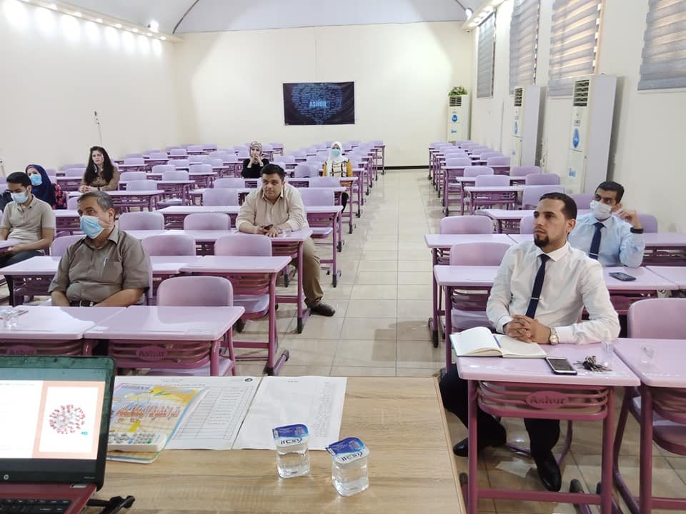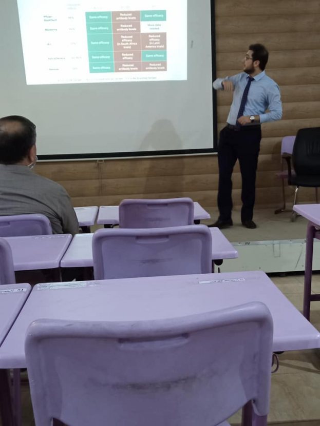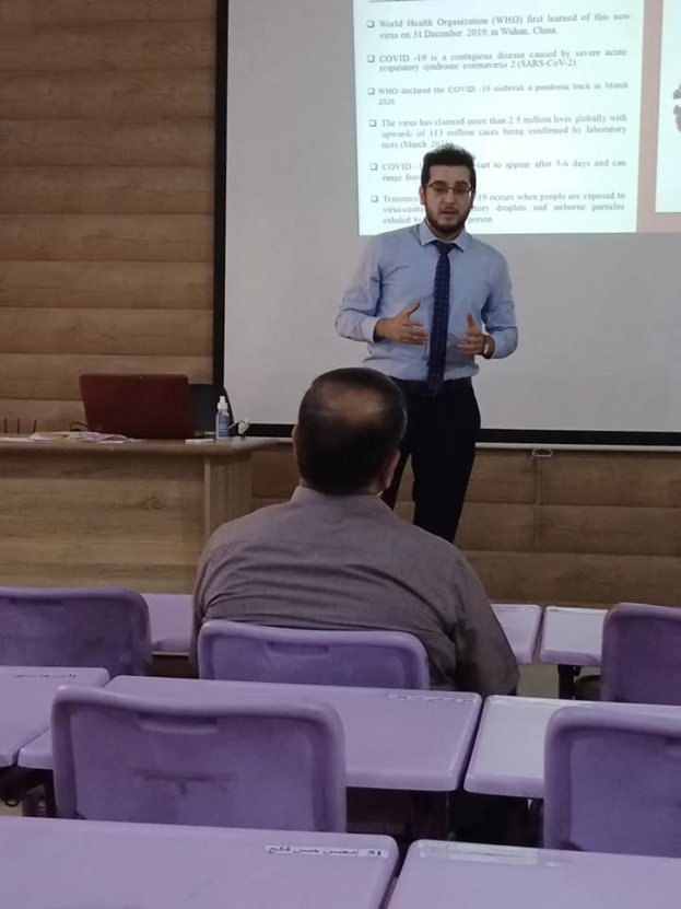ضمن توجيهات السيد عميد كلية آشور الجامعة الأستاذ المساعد الدكتور كاظم عبود عيسى الماجدي المحترم بضرورة الاهتمام بأقامة الندوات والورش وألقاء المحاضرات العلمية وبحضور السيد معاون العميد للشؤون العلمية الاستاذ الدكتور غسان قاسم اللامي نظم قسم الصيدلة يوم الاحد الموافق٢٠٢١/٦/٦محاضرة علمية تحت عنوان ( فيروس كوفيد19 مأمونيته وأهميته ) ألقاها الأستاذ م.م.علي حكمت التدريسي في قسم الصيدلة بحضور عدد من رؤساء الاقسام والتدريسيين والطلبة وقد اشتملت المحاضرة على المحاور التالية: