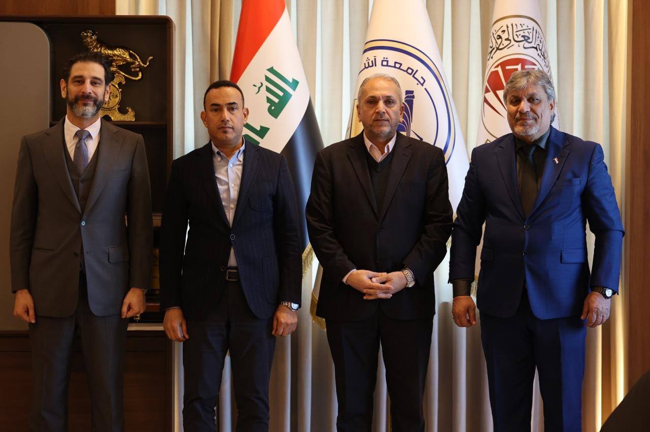 حيث استقبل في مكتبه السيد رئيس جامعة اشور الدكتور كاظم الماجدي مستشار رئيس مجلس الوزراء الدكتور حسين فلامرز رئيس فريق مبادرة ريادة والمستشار عامر العضاض بحضور المساعد العلمي الدكتور سمير اليارة.