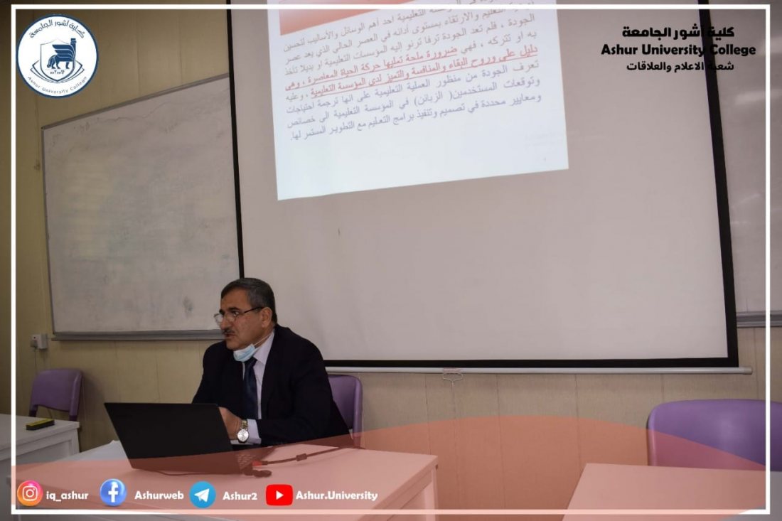 برعاية السيد عميد كلية آشور الجامعة الأستاذ المساعد الدكتور كاظم عبود الماجدي المحترم أقيمت يوم الاربعاء الموافق ٢٠٢٢/١/١٢ ورشة علمية من قبل الاستاذ الدكتور غسان قاسم اللامي معاون العميد للشؤون العلمية تحت عنوان ( إدارة الجودة الشاملة في المؤسسات التعليمية ) ،وركزت الورشة على إبعاد تطبيق إدارة الجودة الشاملة في الكليات والمراكز العلمية فضلاً عن التطرق لانموذج عملي لتعميق هذه الفلسفة في ميادين العمل العلمية .وعرضت في الورشة النماذج العالمية في هذا المجال وبشكل خاص التجربتين الأمريكية واليابانية لإدارة الجودة الشاملة في التعليم العالي .وحضر الورشة السادة رؤوساء الأقسام وعدد من الأساتذة والطلبة ،واتسمت بنقاشات كثيرة من قبل السادة الحضور لأهميتها في مجال التعليم العالي .