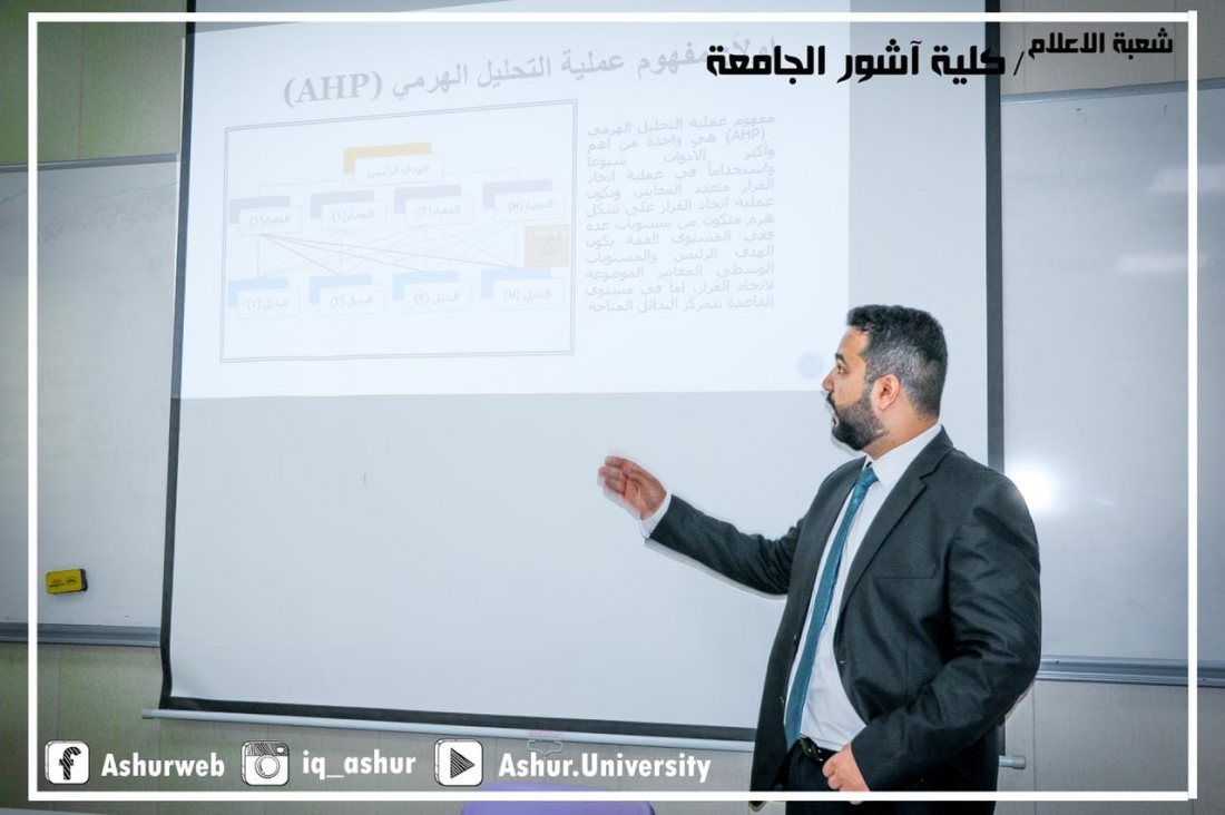 برعاية السيد عميد كلية آشور الجامعة الأستاذ المساعد الدكتور كاظم عبود الماجدي المحترم واشراف ألاستاذ المساعد الدكتور سعد الخفاجي رئيس قسم هندسة تقنيات الأجهزة الطبية في كلية آشور عقد الاستاذ م.م ( علاء عبد الحسين نوري ) التدريسي في القسم ورشة عمل علمية يوم الاثنين الموافق ٢٠٢٢/٣/٢٨ تحت عنوانFuzzy Analytic Hierarchy Process (FAHP ( عملية التحليل الهرمي الضبابي ) وحضرها السيد عميد كلية آشور الجامعة الأستاذ المساعد الدكتور كاظم عبود الماجدي المحترم والسيد معاون العميد الاستاذ الدكتور غسان قاسم المحترم وعدد من الأساتذة والطلاب الذين أشادوا بالمعلومات التي قدمها السيد المحاضر في الورشة.