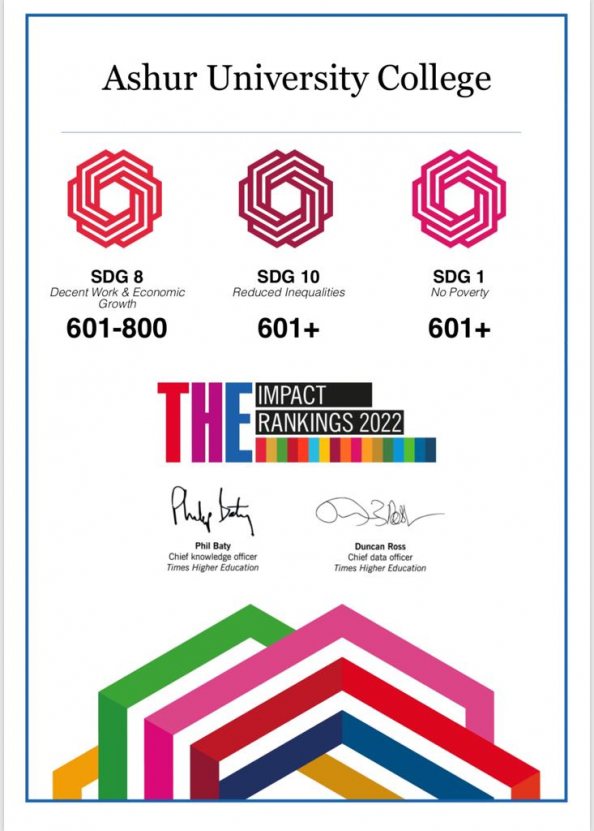 انجاز علمي كبير لكلية آشور الجامعة في بغداد بدخولها تصنيف التايمز البريطاني لأهداف التنمية المستدامة للامم المتحدة :
