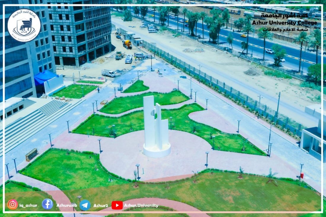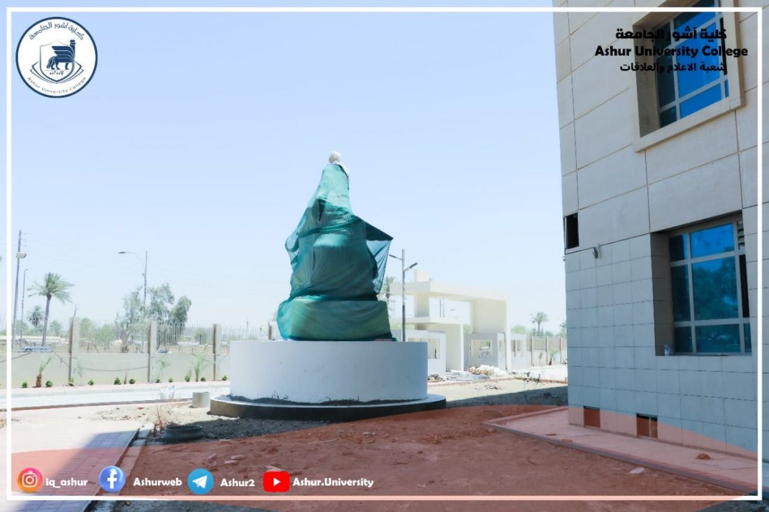 كانت البداية ارض جرداء ولكن بطموح وجهود المسؤولين المتمثلة برئاسة آشور تحولت هذة الارض الصماء إلى صرح ينطق بالحياة من خلال حركة الآليات والمهندسين والعمال في بناء الصرح العلمي الذي يليق بالعراق (بلد الحضارة ) ،ليبدء الشموخ شيئا فشيئا وليترجموا تصميم المهندسة ( آن سماري ابراهيم )على أرض الواقع والذي ابدعت في إضافة لمستها الفنية الجميله من خلال تصميم نصب رائعة زينت واجهة الجامعة.