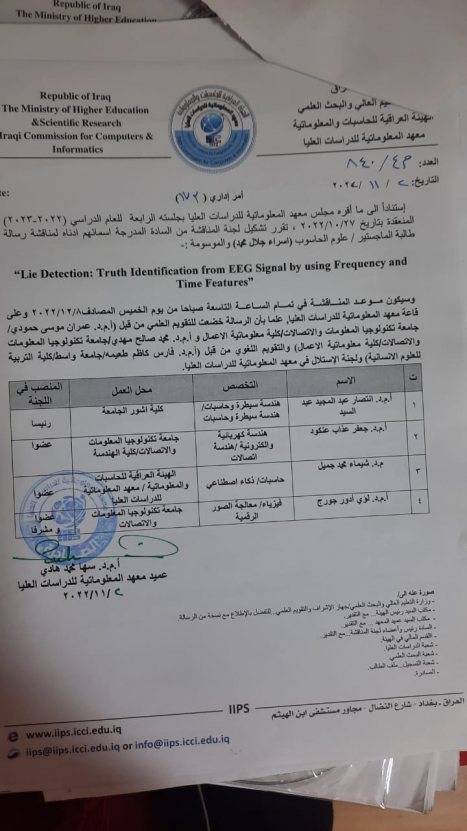 بدعوة من الهيئة العراقية للحاسبات والمعلوماتية/ معهد المعلوماتية للدراسات العليا ترأست الدكتورة انتصار عبد المجيد السيد التدريسية في قسم هندسة تقنيات الأجهزة الطبية في كلية آشور الجامعة لجنة مناقشة طالبة الدراسات العليا / الماجستير -علوم الحاسوب اسراء جلال محمد التي جرت على قاعة المعهد يوم الخميس الموافق ٢٠٢٢/١٢/٨.