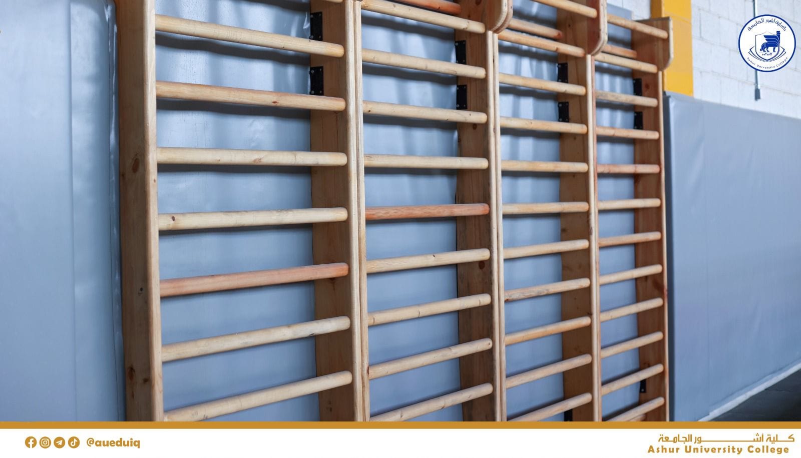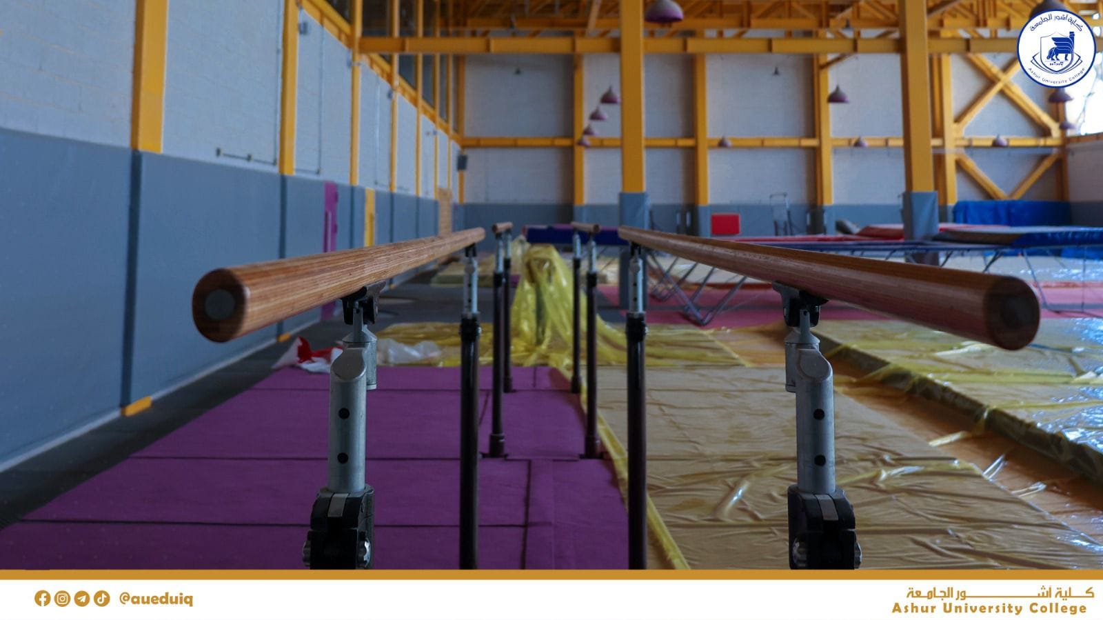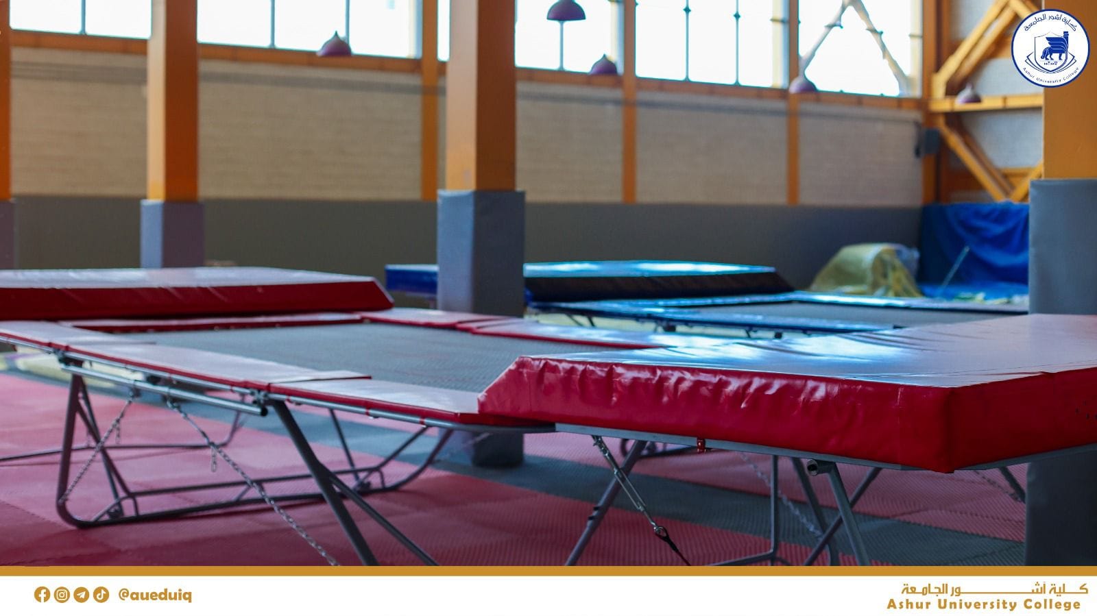 القاعات الرياضية المغلقة في كلية آشور الجامعة حيث تحتوي كليةآشور الجامعة على قاعات رياضية اولمبية خاصة بالرياضات الجماعية والفردية على غرار قاعات كرة السلة والطائرة والتنس وقاعات الجمناستك وكمال الاجسام