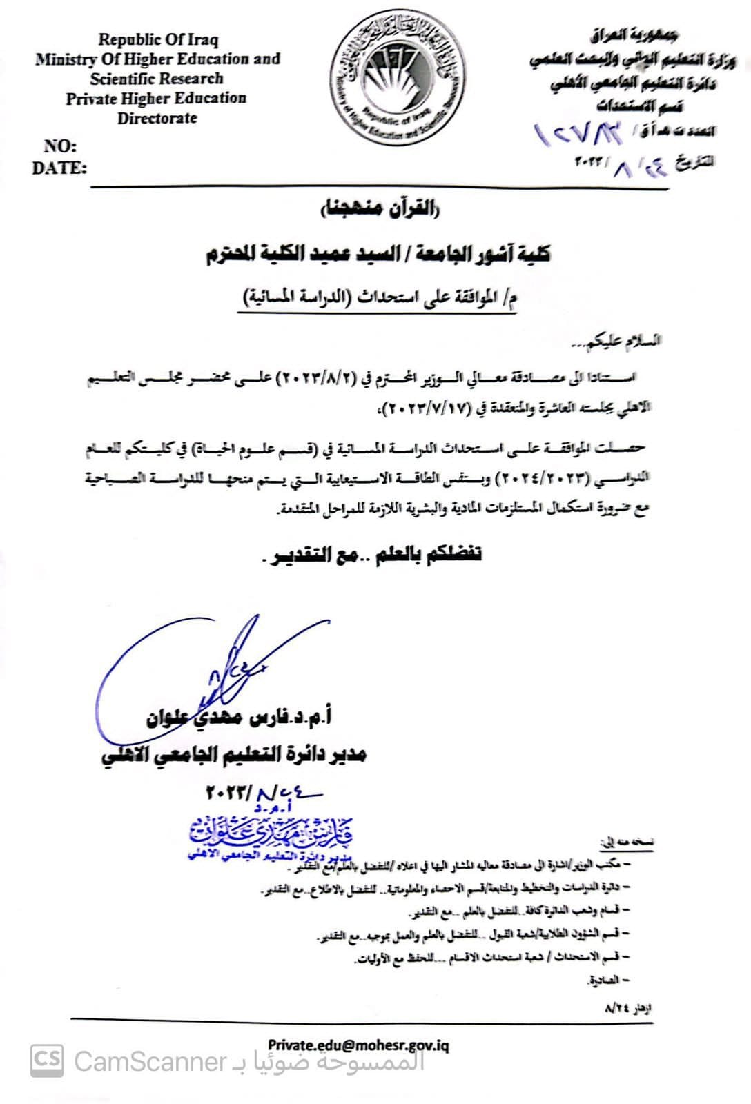 استحداث الدراسة المسائية لقسم علوم الحياة في كلية آشــــــــــــور الجامعة حصلت مصادقة معالي وزير التعليم العالي والبحث العلمي الدكتور نعيم العبودي على محضر مجلس التعليم الأهلي الجامعي الذي تضمن استحداث الدراسة المسائية لقسم علوم الحياة في كلية آشــــــــــــور الجامعة