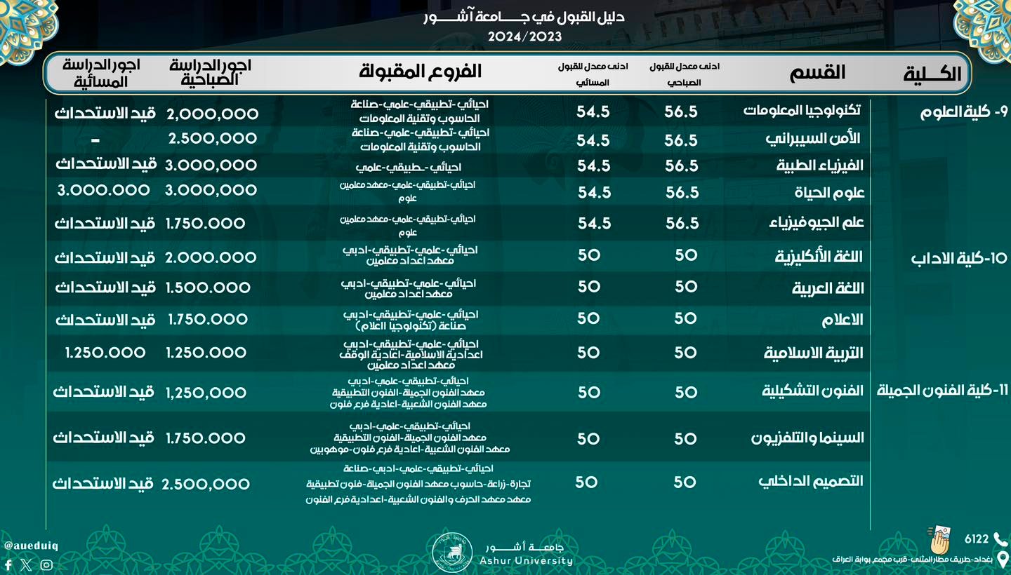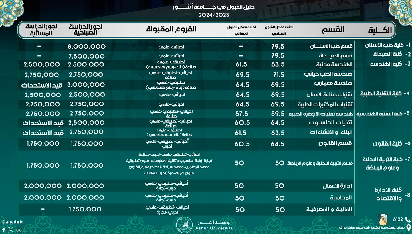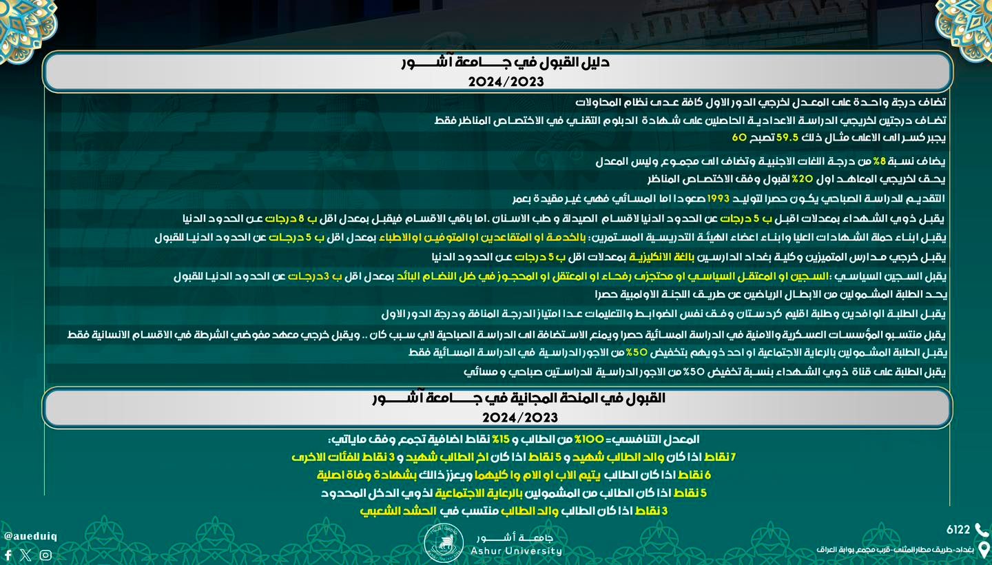 خريجي الدراسة الاعدادية الاعزاء الصور ادناه هي دليل القبول في جامعة آشور ، لذلك يمكنكم الاطلاع عليها واختيار الكليات والأقسام التي ترغبون بها من خلال مراجعة مركز تسجيل واستفسارات الطلبة الجدد في الجامعة وتفعيل حسابكم وبياناتكم خلال هذه المرحلة من أجل الاستعداد لمرحلة التقديم حيث تتواجد كوادرنا يومياً من الساعة ال٨ صباحاً وحتى الساعة ال٦ مساءً