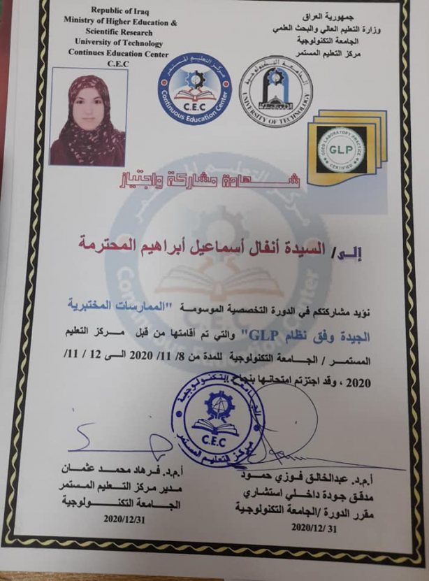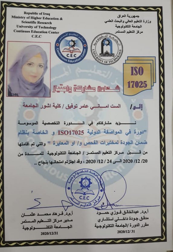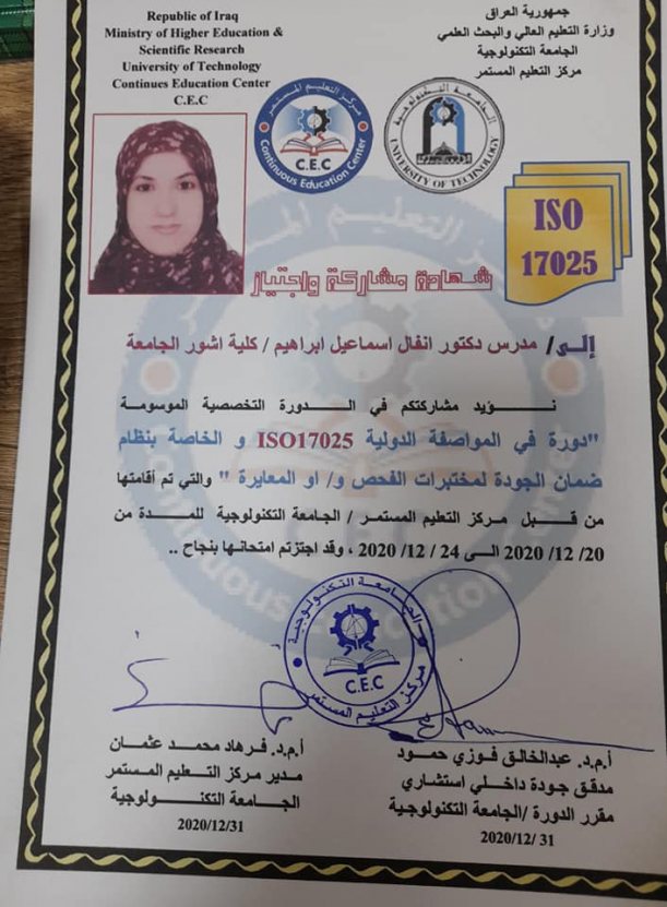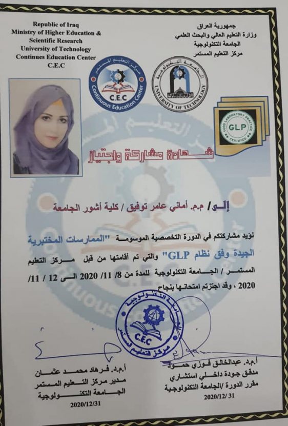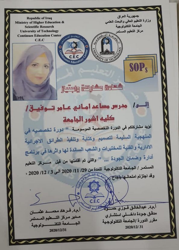 ١ - دورة تخصصية في المنهجية السليمة لتصميم وكتابة وتنفيذ الطرائق الإجرائية والفنية للمختبرات والشعب الساندة لها وأثرها في برنامج إدارة الجودة .