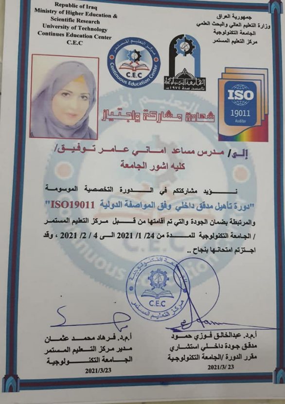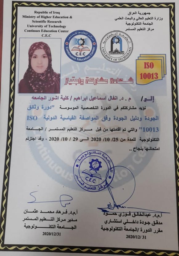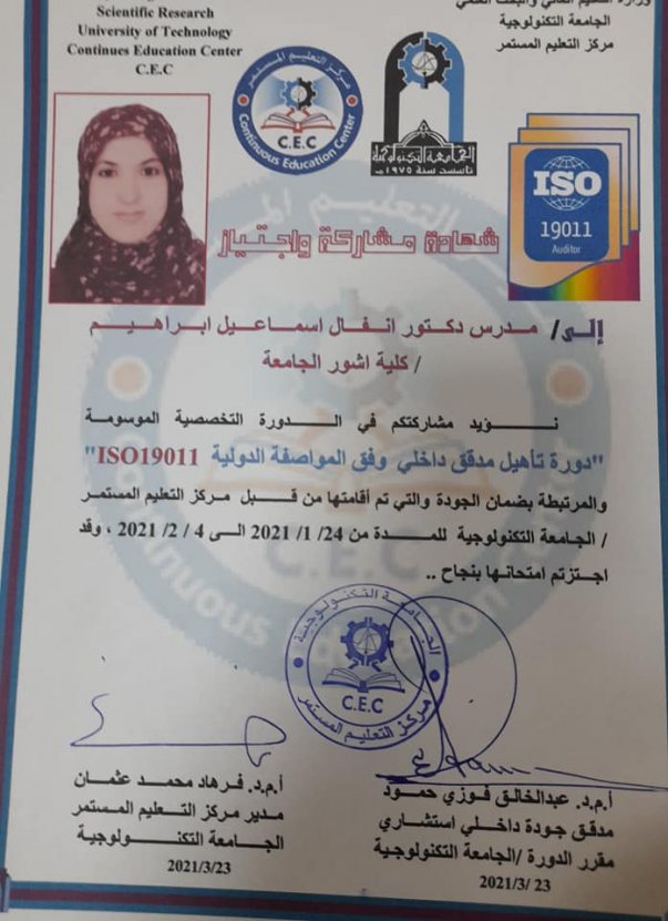 الطموح والإبداع لا يتوقف مادامت هناك رغبة لتطوير العلم خدمة للبلدوطلبتنا الأعزاء وما مشاركة أساتذة كلية اشور الجامعة في مختلف النشاطات العلمية الا من أجل بناء وتقدم هذا الصرح العلمي المتطور ،لذلك فأن كلية اشور الجامعة متمثلة بشخص عميدها الأستاذ المساعد الدكتور كاظم عبود عيسى الماجدي المحترم تبارك للاساتذة من كادر الكلية التدريسي الذين حصلوا على شهادات شكر وتقدير من رئاسة الجامعة التكنولوجية لمشاركتهم واجتيازهم بنجاح دورة ( رؤساء مدققي الجودة )والتي تعتبر من أهم الشهادات الأكاديمية في مجال ضمان الجودة والتي تضمنت خمسة دورات علمية .والكادر التدريسي في كلية اشور الجامعة الذين حصلوا على شهادات المشاركة هم :