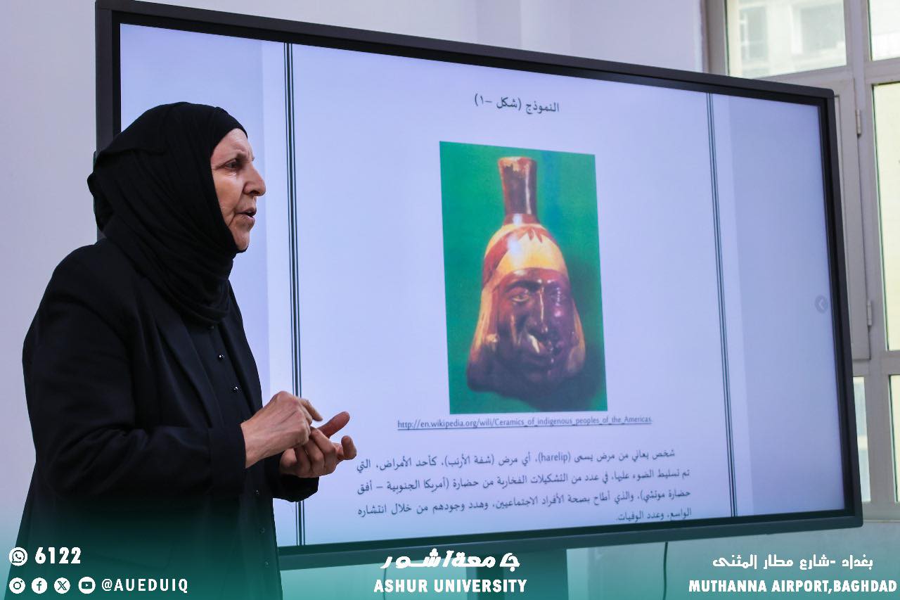 برعـاية السيـد رئيس جامعـة اشور المحترم الاستاذ الدكتور (كاظـم عبود الماجـدي) وباشراف الاستاذ المساعد الدكتور متي علو بولص المحترم عميد كلية الفنون الجميلة اقيمت ورشة العمل الموسومة ( التشكيلات الفخارية والخزفية الواقعية القديمة في امريكا (حضارة موتشي) يوم الاحد الموافق 21/4/2024 وبتقديم الدكتورة (عليه محسن).