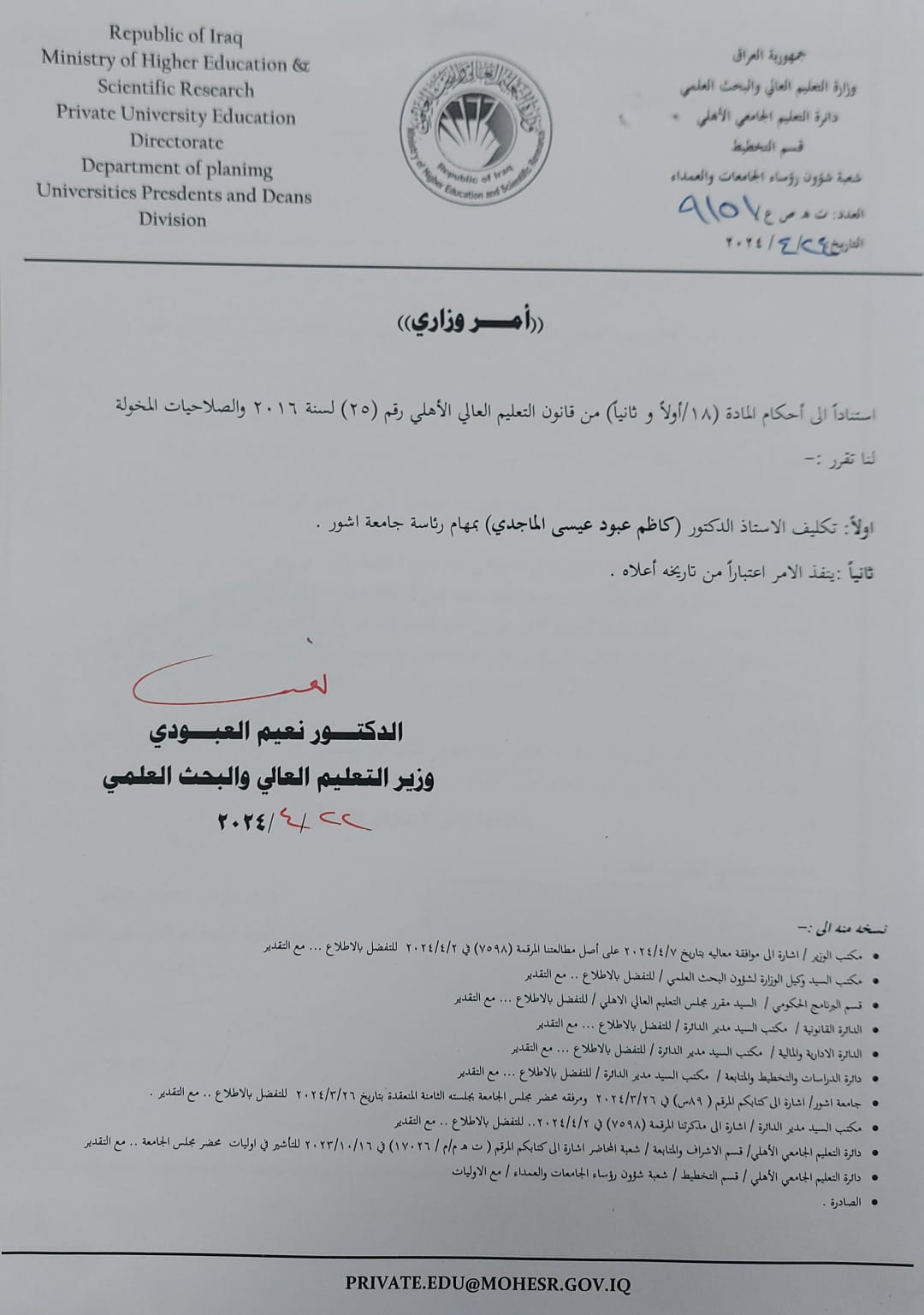 تكليف الاستاذ الدكتور كاظم عبود الماجدي برئاسة جامعة آشور