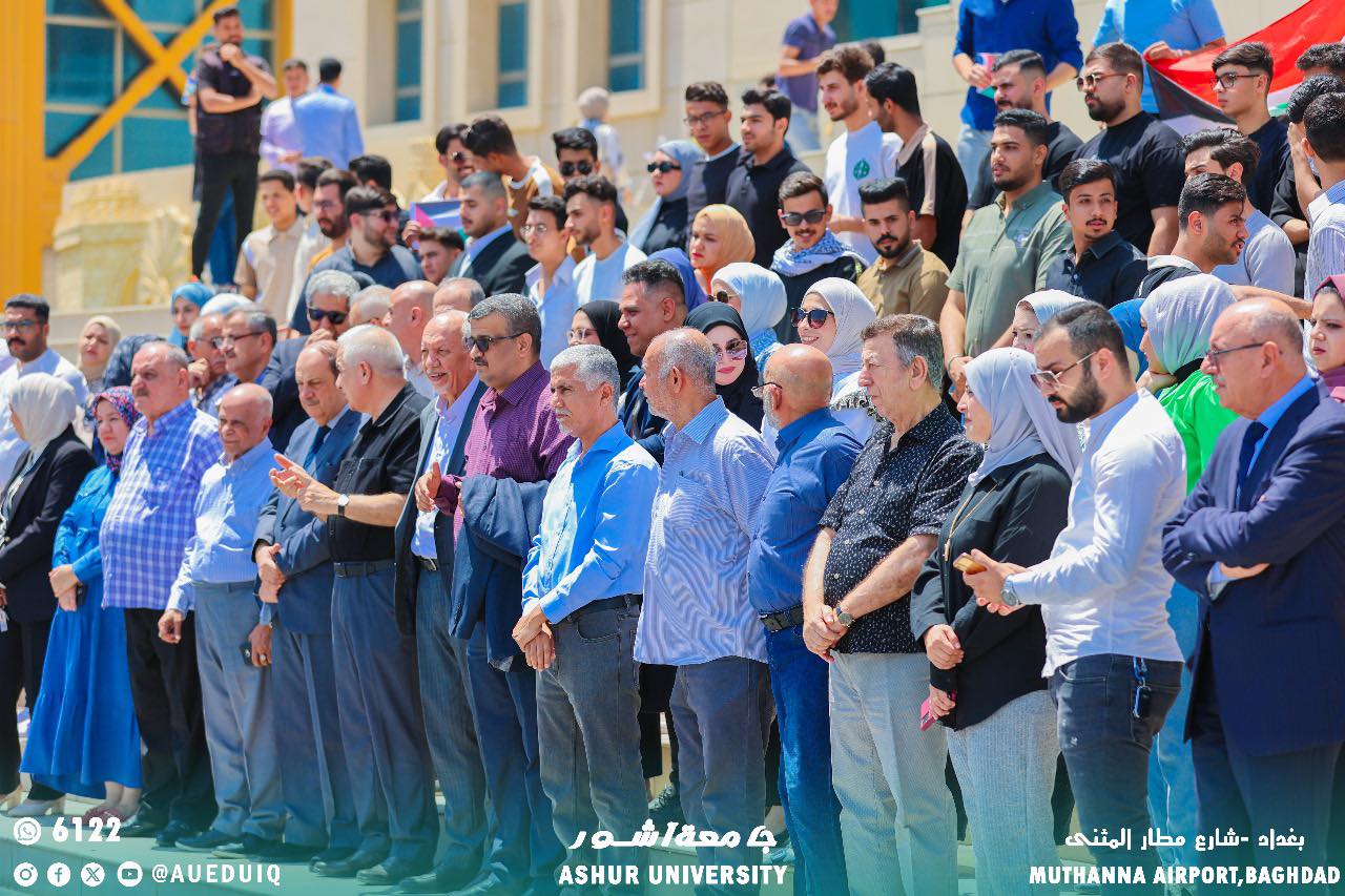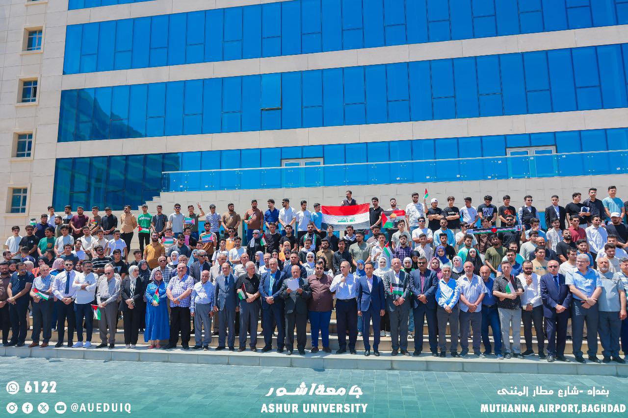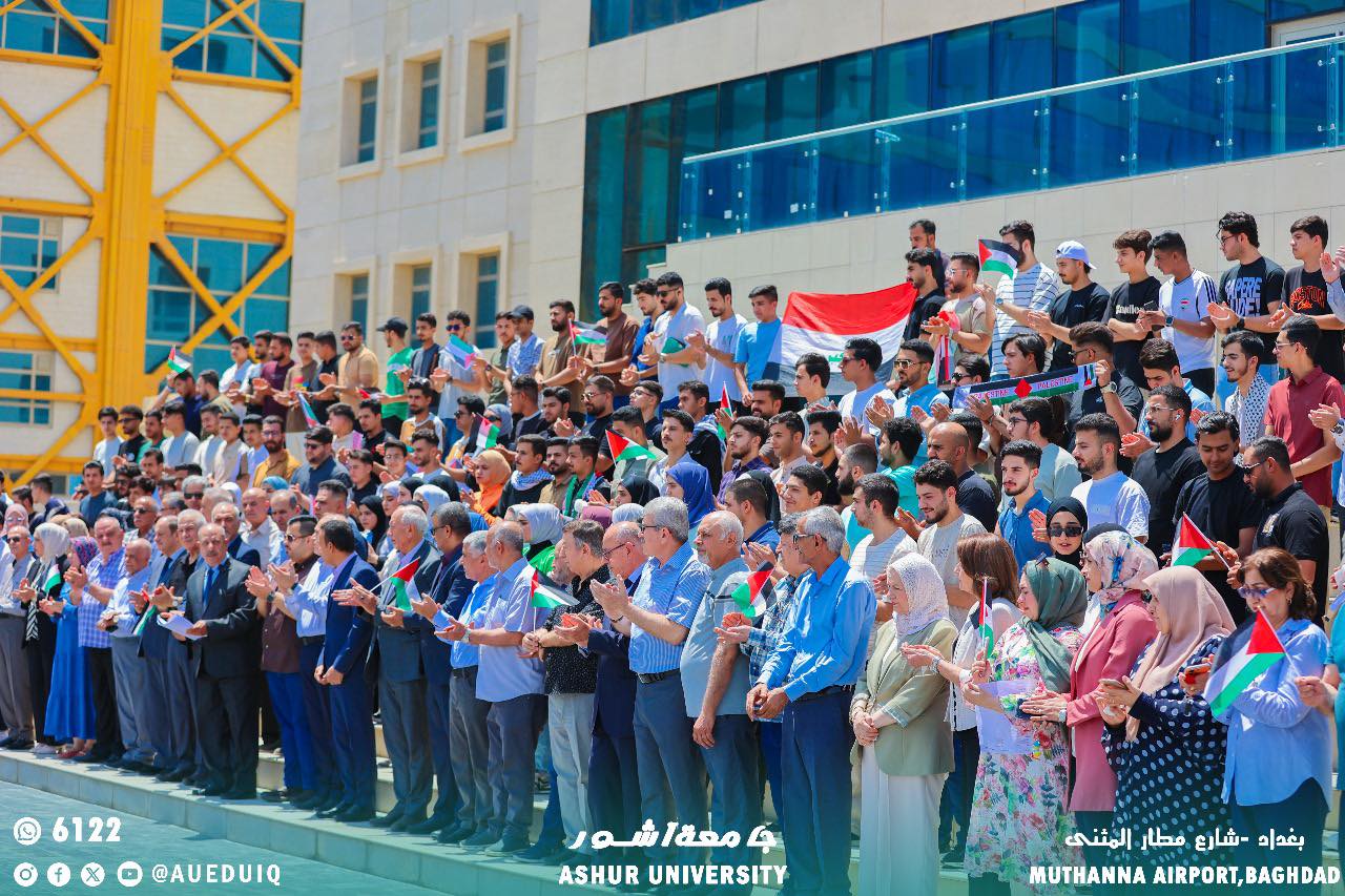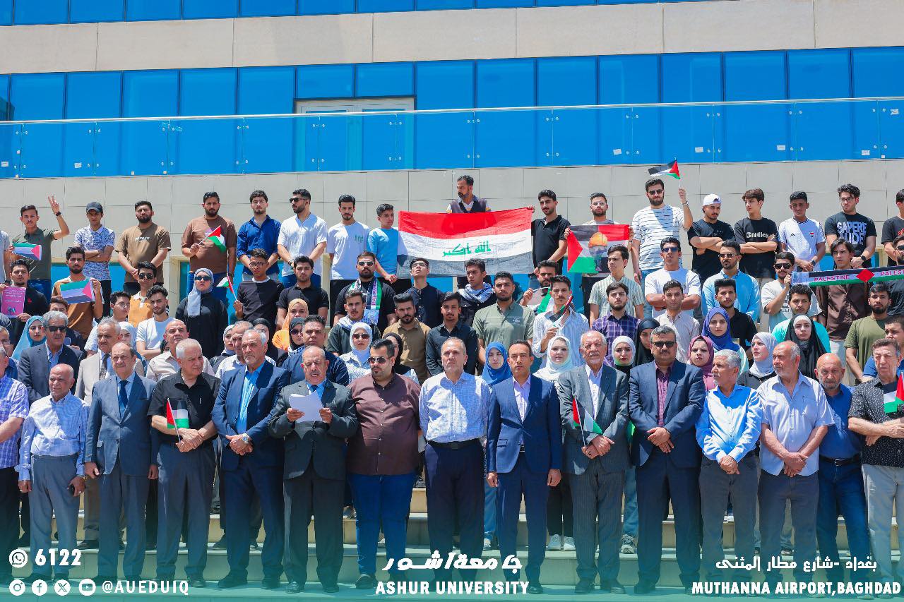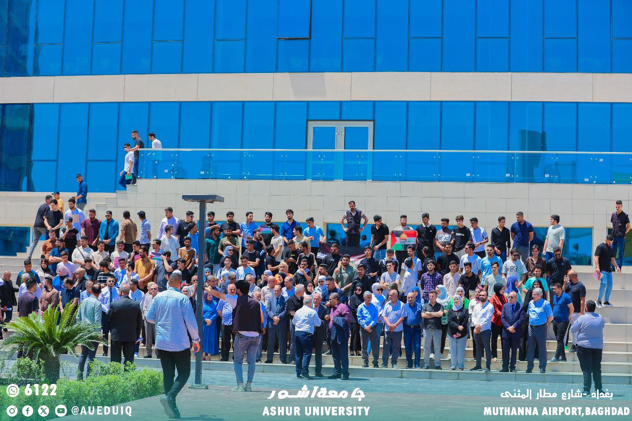 تضامنا مع اهلنا الصابرين والمج_اهدين في فلس_طين العربية ومؤازرة لابطال غ_زة وشعبها الصابر المج_اهد وتاييدا لضربات المق_اومة الفلس_طينية على الارض يقف اليوم السبت الموافق ٤/ ٥/ ٢٠٢٤ اساتذة وطلبة وموظفي جامعة اشور وقفة تضامنية مع قضية فلس_طين العادلة ودعما لصمود شعبنا الفلس_طيني في مق_اومة العدوان الصه_يوني ومجا_زره الوح_شية بحق الأطفال والنساء والشيوخ في غ_زة الع_زة