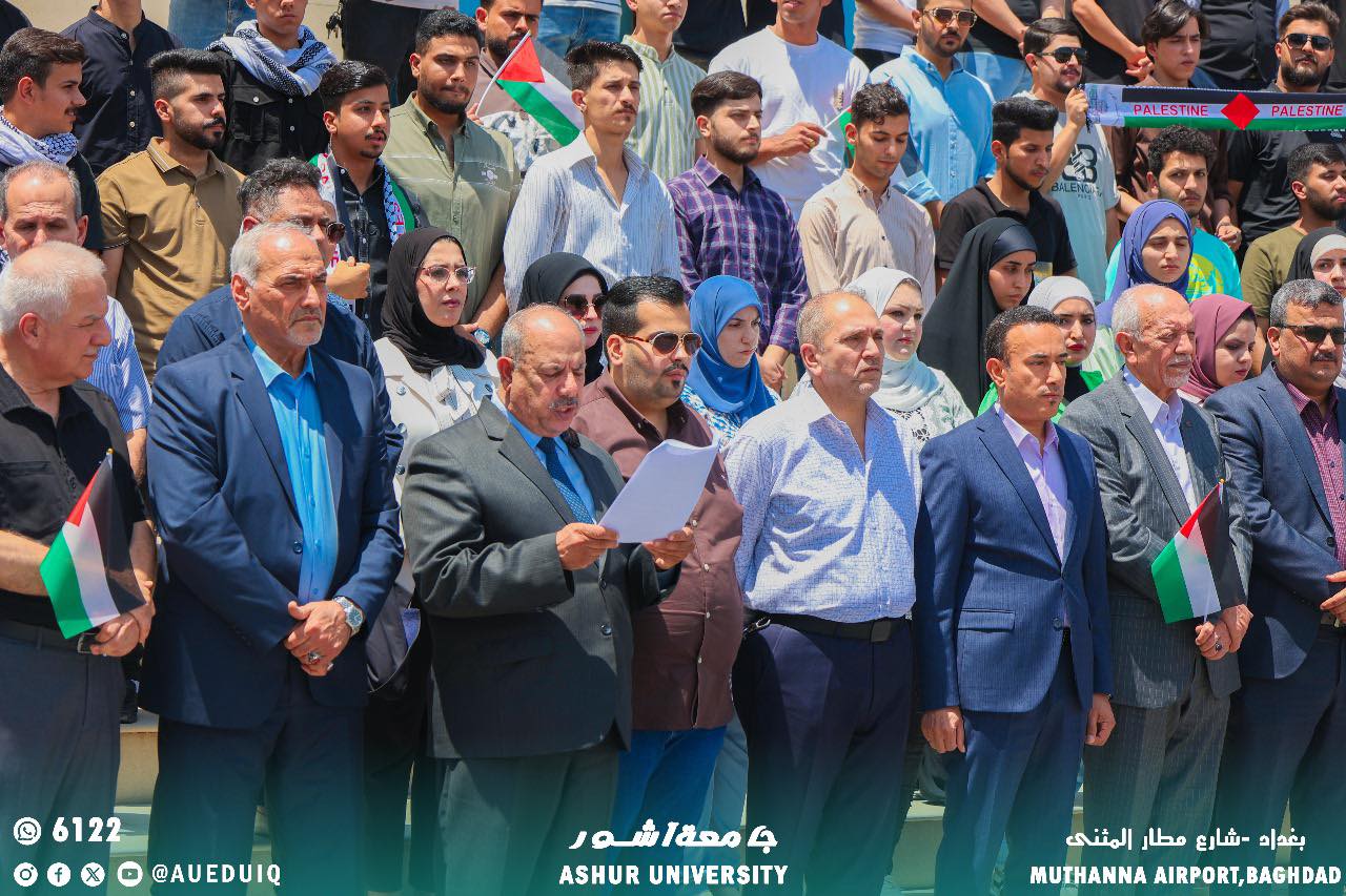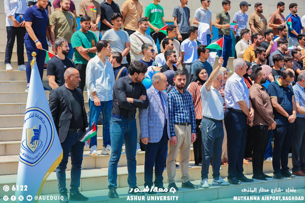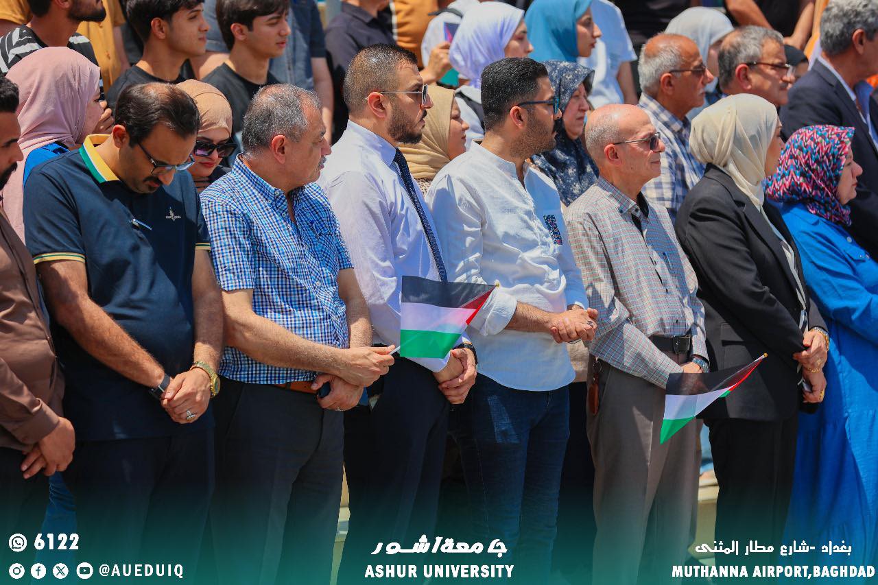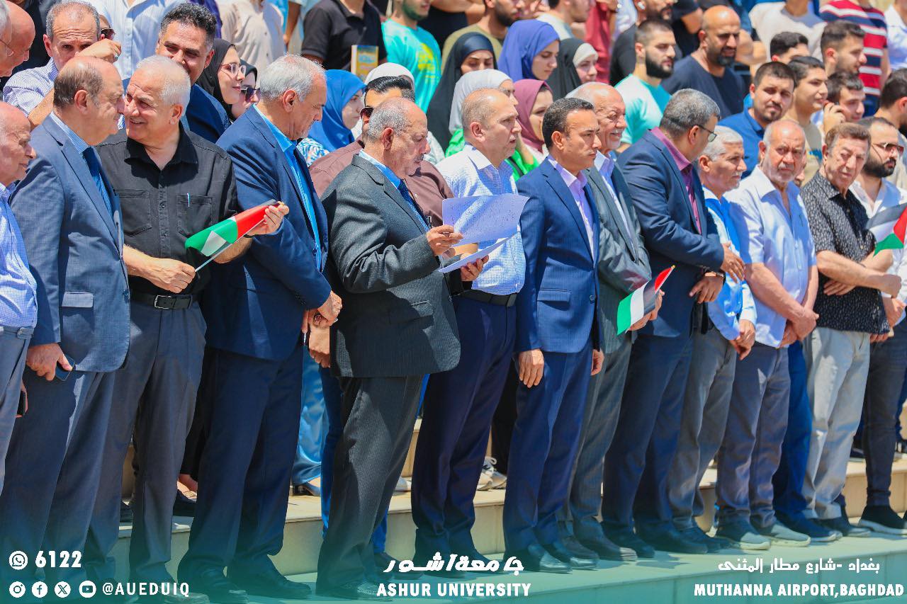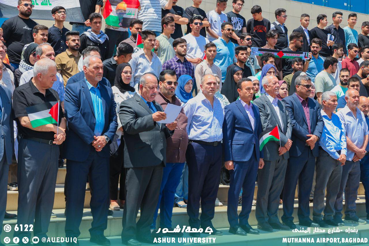 تضامنا مع اهلنا الصابرين والمج_اهدين في فلس_طين العربية ومؤازرة لابطال غ_زة وشعبها الصابر المج_اهد وتاييدا لضربات المق_اومة الفلس_طينية على الارض يقف اليوم السبت الموافق ٤/ ٥/ ٢٠٢٤ اساتذة وطلبة وموظفي جامعة اشور وقفة تضامنية مع قضية فلس_طين العادلة ودعما لصمود شعبنا الفلس_طيني في مق_اومة العدوان الصه_يوني ومجا_زره الوح_شية بحق الأطفال والنساء والشيوخ في غ_زة الع_زة