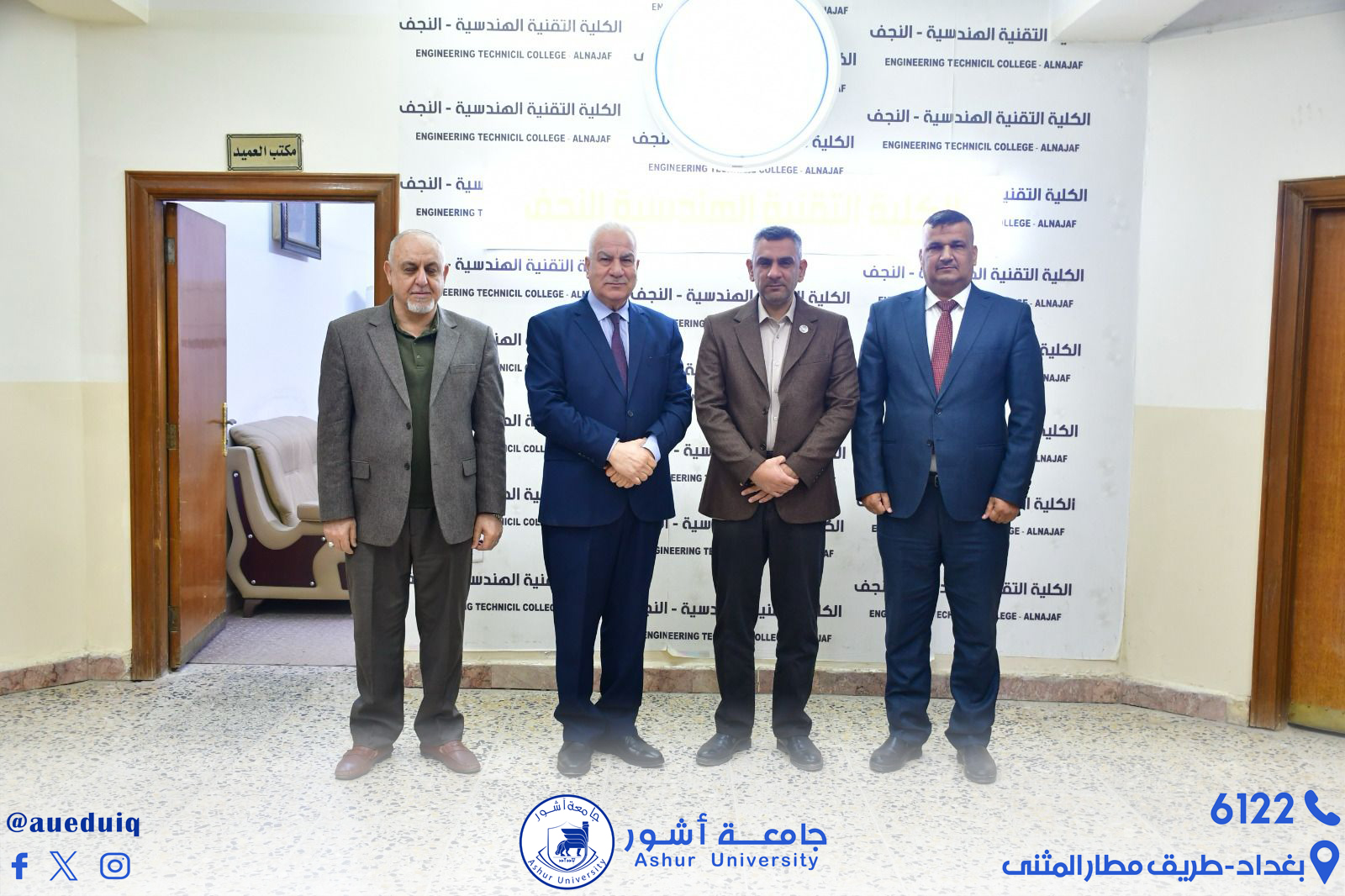وفي اطار التوأمة والتعاون العلمي المشترك قام وفد من جامعة آشور برئاسة الاستاذ الدكتور طلال الججاوي عميد كلية الادارة والاقتصاد والاستاذ المساعد الدكتور سعد الخفاجي عميد الكلية التقنية الهندسية بزيارة جامعة الفرات الاوسط التقنية في الكوفة بمحافظة النجف وقدم الوفد التهاني والتمنيات ودرع الجامعة للسيد رئيس الجامعة لمناسبة تسنمه مهام رئاسة الجامعة وتناول اللقاء افاق التعاون بين الجامعتين ثم تم التوقيع على اتفاقية التوأمة والتعاون المشترك بين الجامعتين تناولت مجالات التعاون فيما يخص قسم هندسة تقنيات الاتصالات ضمن مسار بولونا