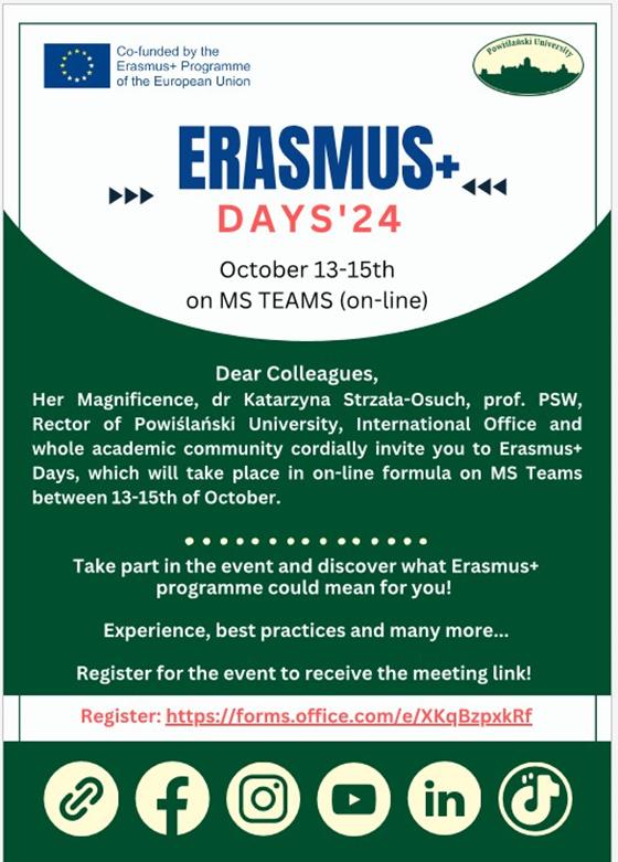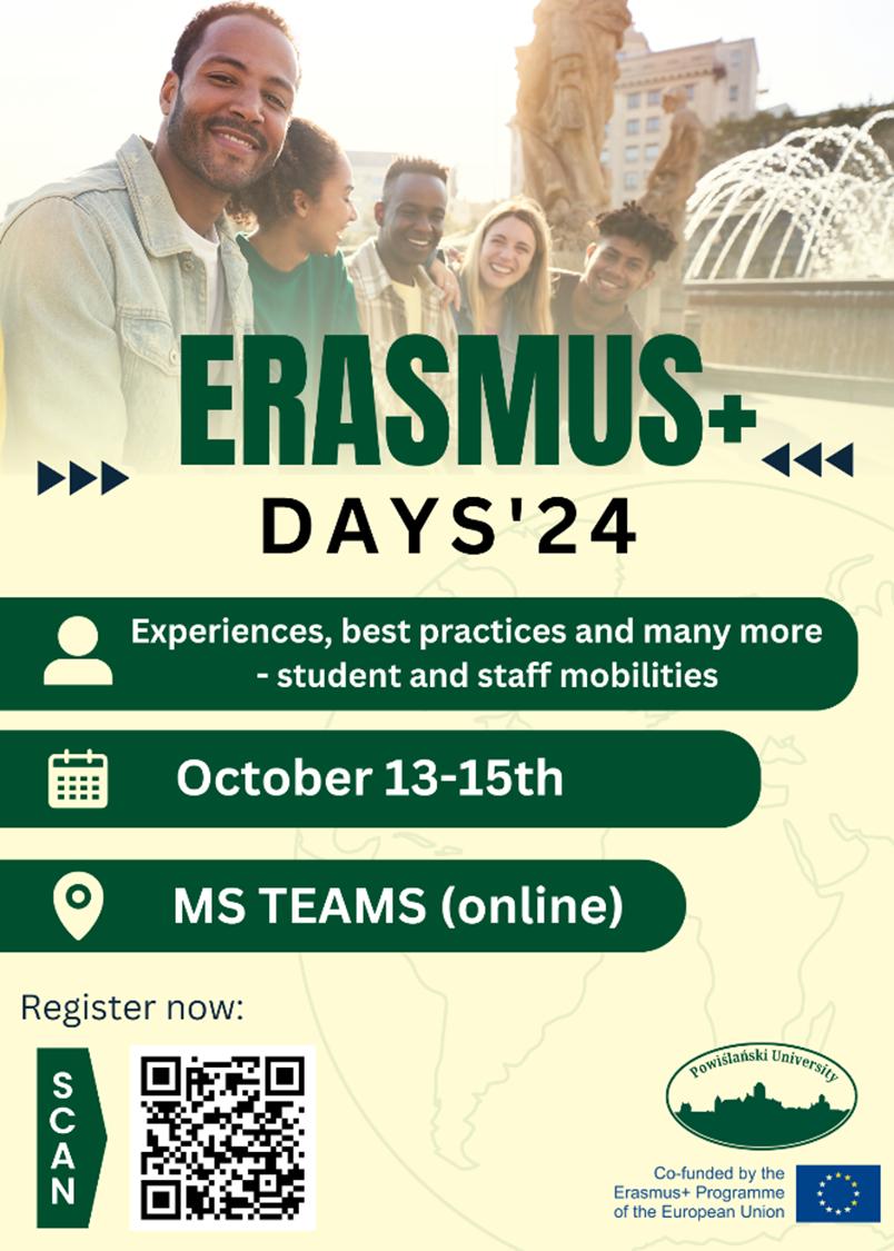 يسعدنا أن نعلمك بحدث Erasmus+ Days'24 القادم، الذي تنظمه جامعة Powiślański يومي 13 و14 أكتوبر. يوفر هذا الحدث منصة فريدة للطلاب والموظفين لاكتشاف واغتنام الفرص المذهلة في إطار برنامج إيراسموس+.